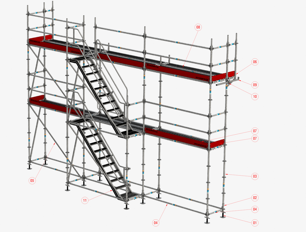 Si quieres utilizar RINGSCAFF como plataforma de trabajo, solución puente o estructura de apoyo, depende de ti y de tu aplicación. Con sólo unos pocos componentes adicionales, el material RINGSCAFF puede utilizarse para construir torres de escaleras de construcción o de emergencia o el sistema de andamio colgante RINGSCAFF Sky. La mezcla de certificaciones con otros sistemas de andamios modulares convencionales también proporciona un máximo de flexibilidad y uso sostenible del material.